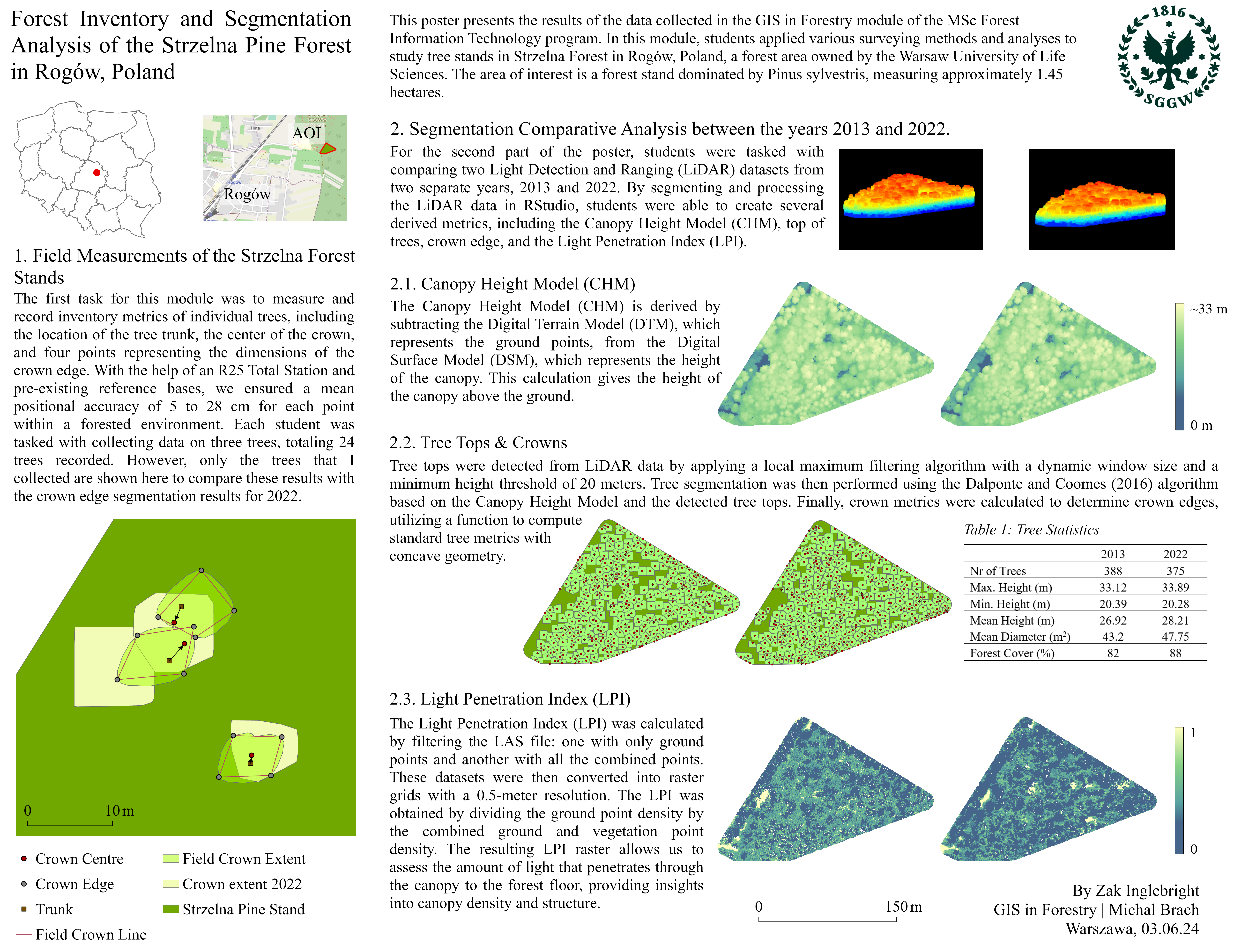 This poster presents a comparative analysis of tree stands in Strzelna Forest, Poland, using field measurements and LiDAR datasets from 2013 and 2022, both processed in R. HNEE coursework for GIS in Forestry. Made using R & ArcGIS Pro.