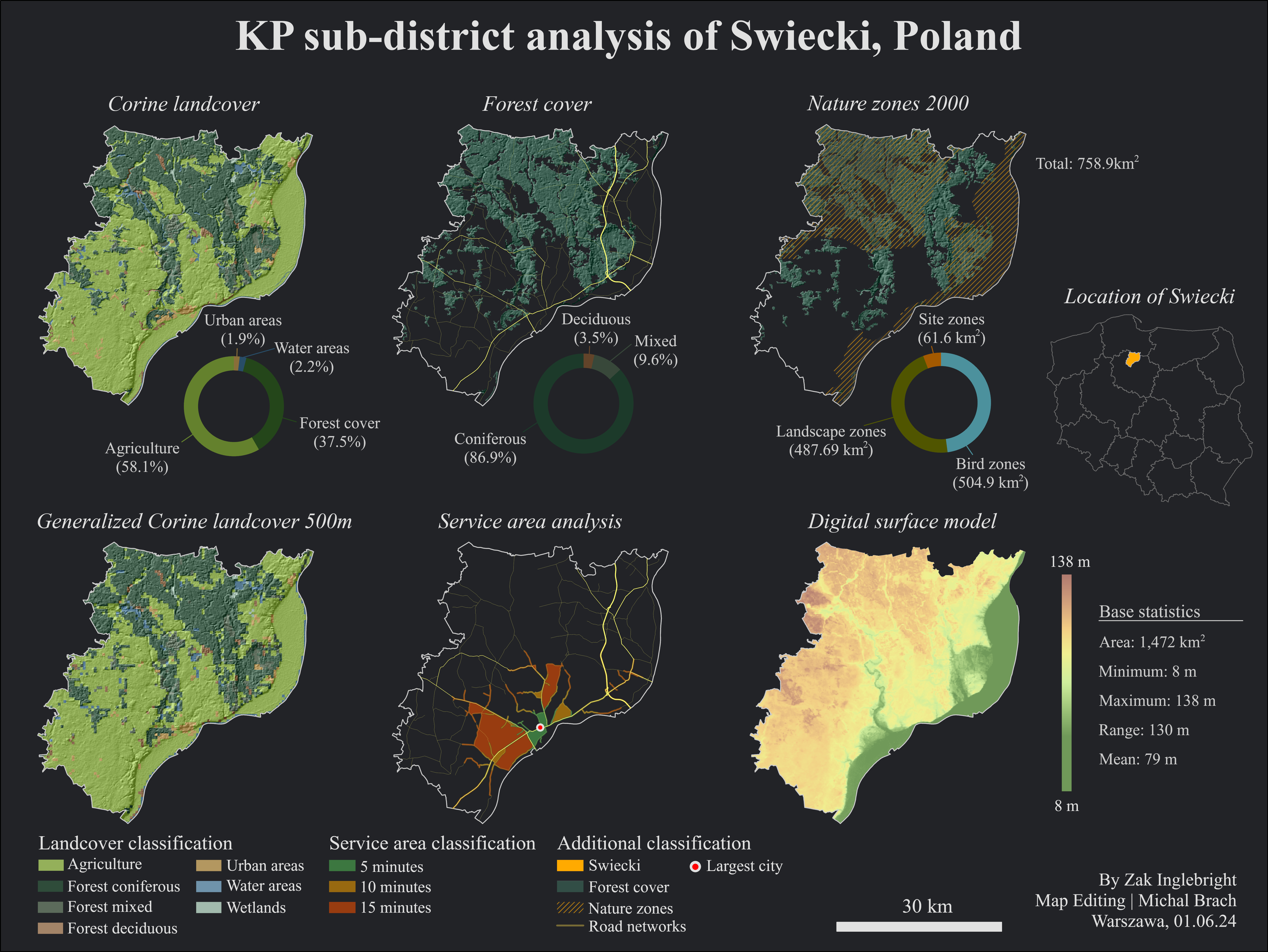 An in-depth analysis of Swiecki, Poland, showcasing landcover types, forest cover distribution, nature zones, generalized landcover, service area accessibility, and digital surface model elevation data. HNEE coursework for Map Editing. Made using ArcGIS Pro.