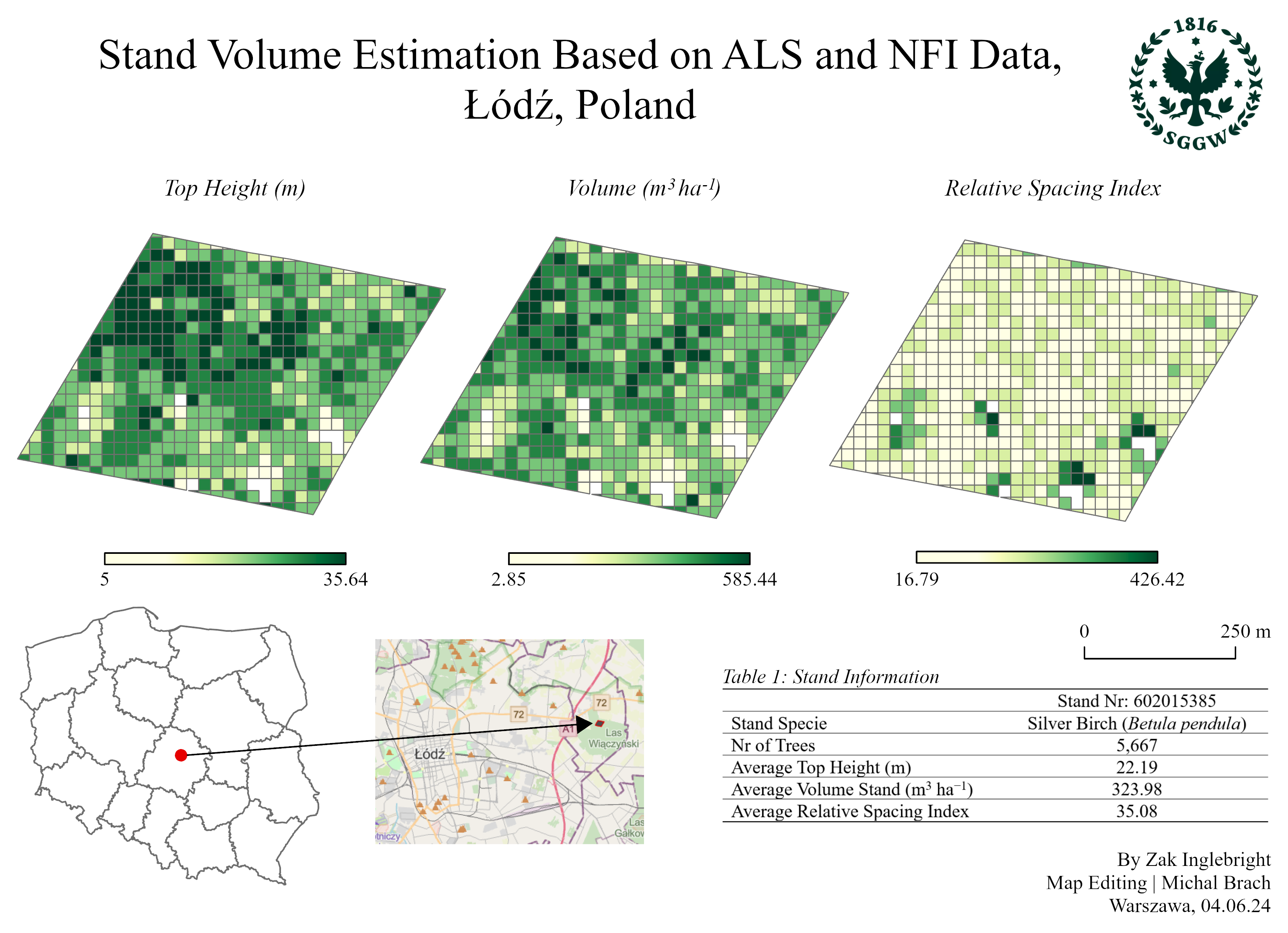 An analysis of forest stand volume using ALS and national forestry inventory data, with preprocessing and calculations performed using R. HNEE coursework for Map Editing. Made using R & ArcGIS Pro.