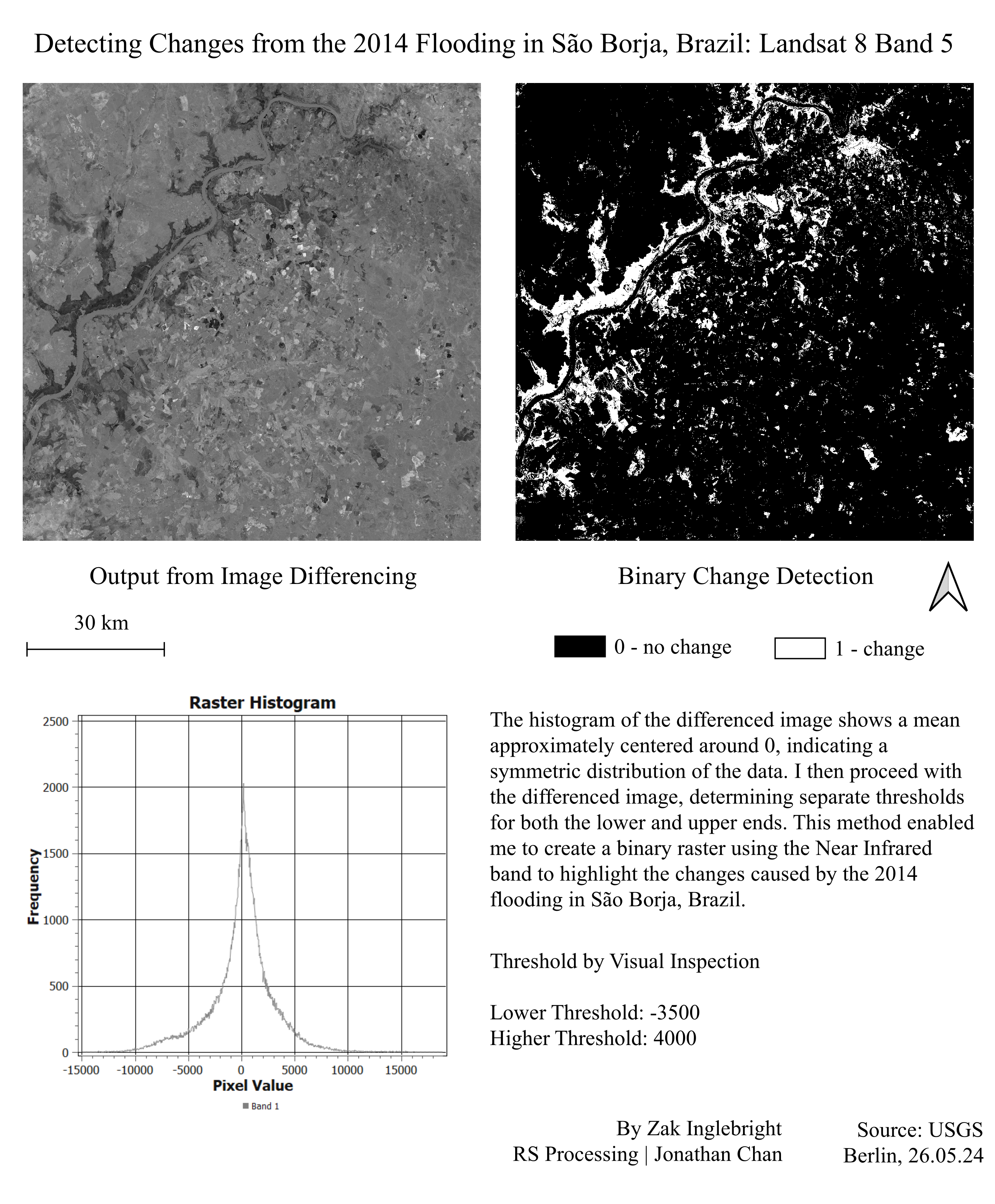 This analysis uses Landsat 8 Band 5 imagery to detect changes caused by the 2014 flooding in São Borja, Brazil. The process involves image differencing, resulting from visual thresholding to highlight areas of change. HNEE coursework for Remote Sensing Processing. Made using QGIS.