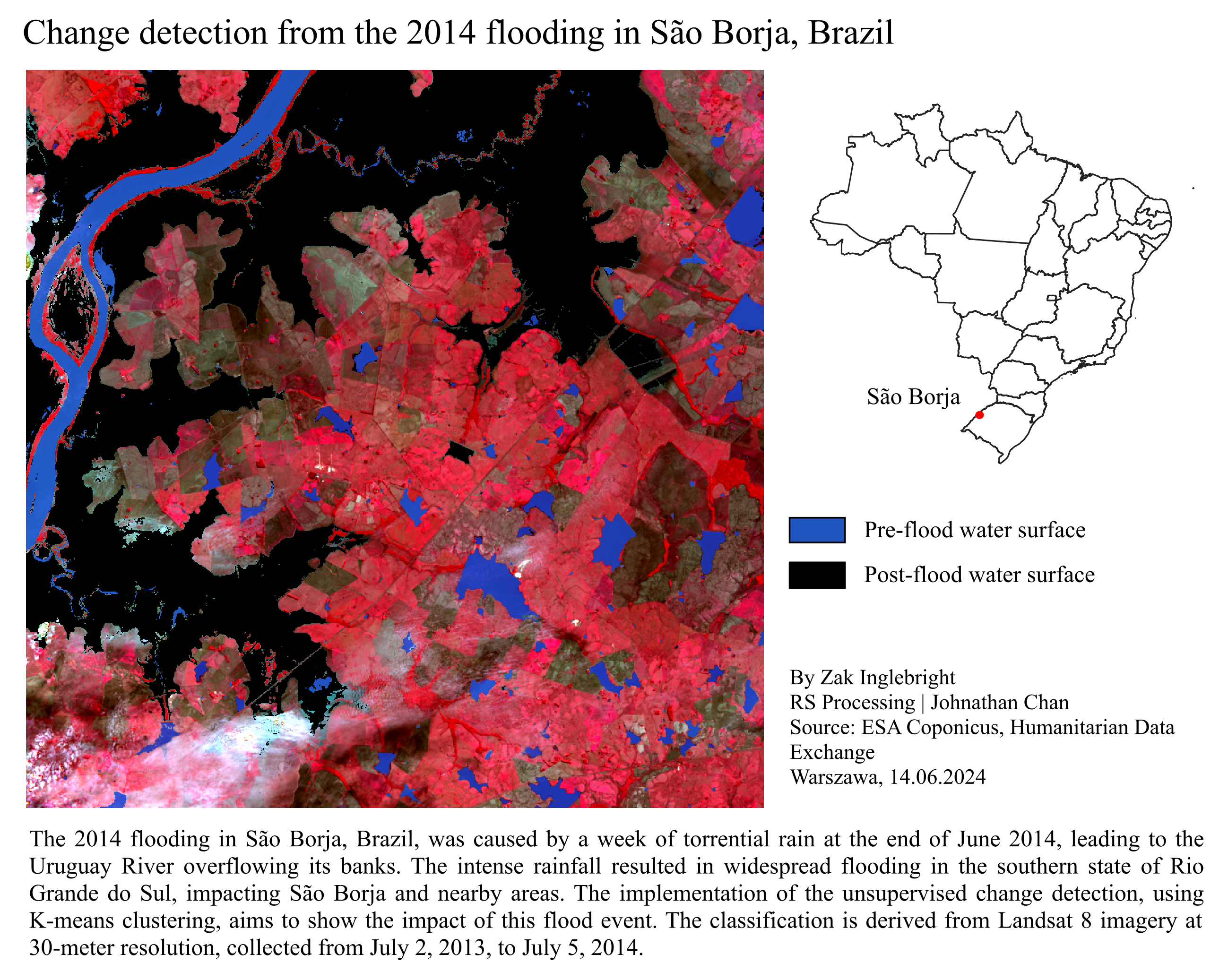This map shows the 2014 flooding impact in São Borja, Brazil, using Landsat 8 imagery and K-means clustering. HNEE coursework for Remote Sensing Processing. Made using QGIS.
