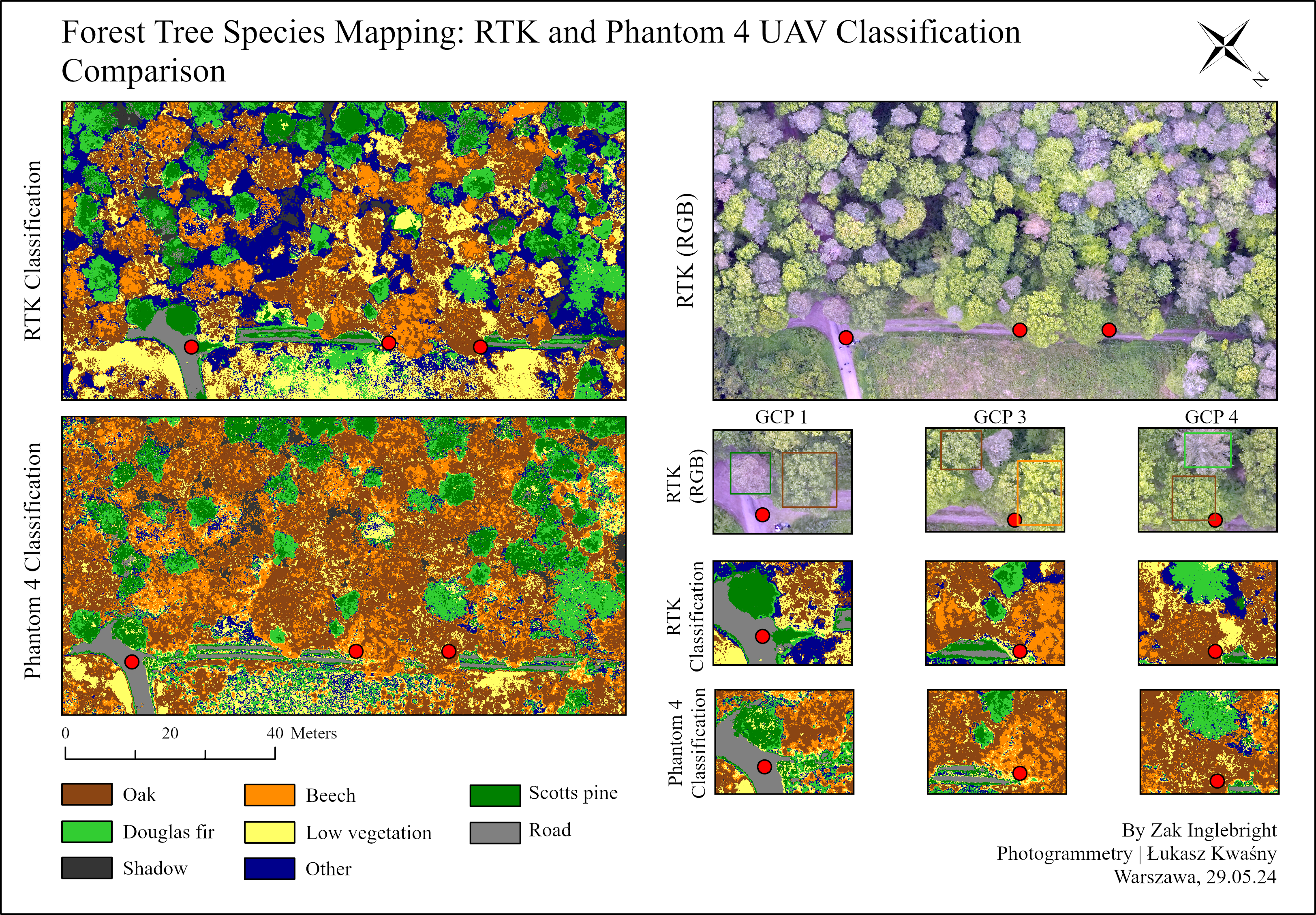 Compares the accuracy of supervised classification for forest tree species mapping using two drones: RTK and Phantom 4 UAV. HNEE coursework for Photogrammetry. Made using ArcGIS Pro.